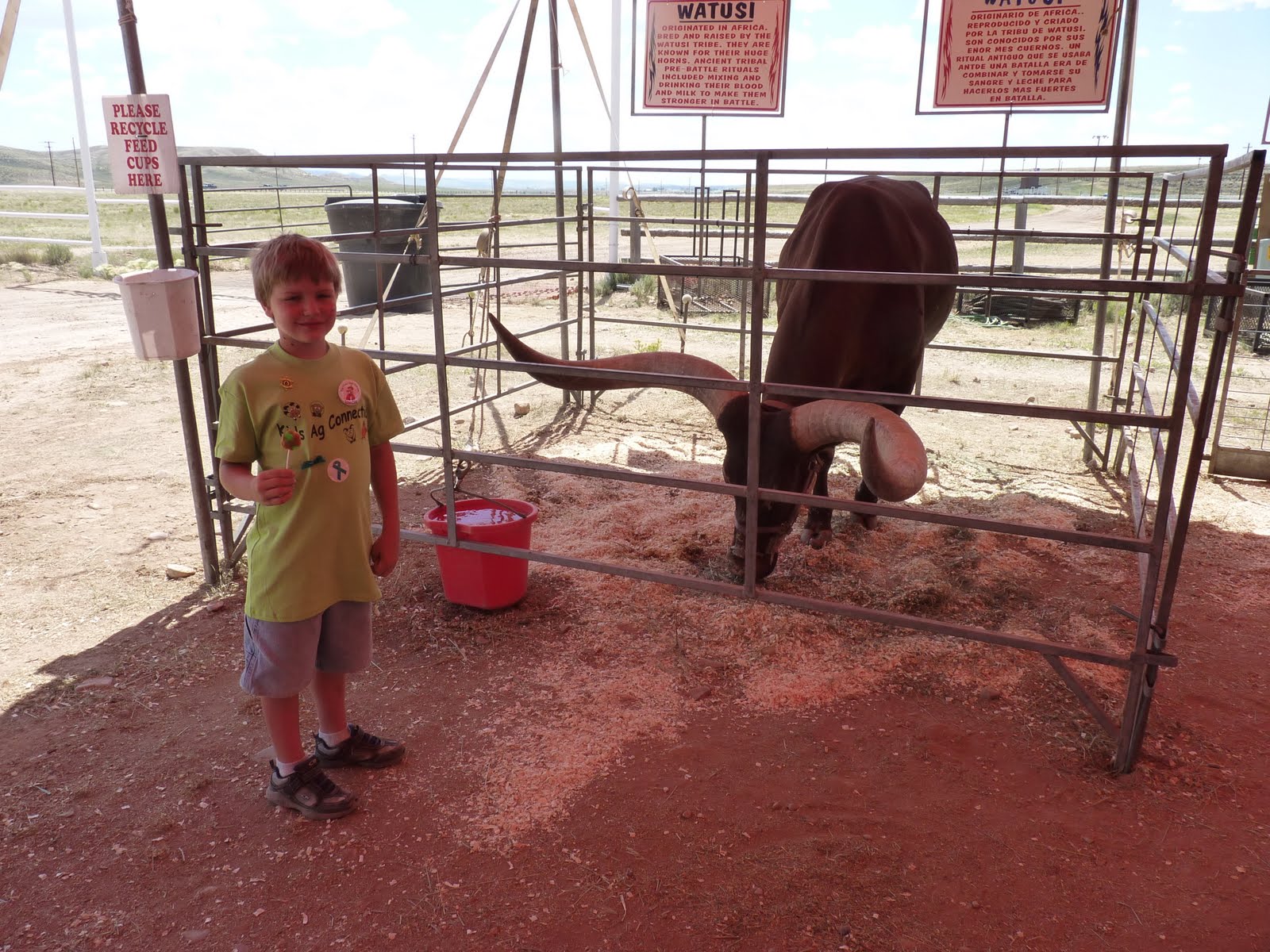 This cow (or whatever it was) is called a Watusi - known for their big horns. The picture doesn't do it justice. The horns were easily 5-6 feet EACH. The 7 year old once wrote a book he titled "Big Horns" which was about bull riding, so I wanted to get his picture with this real big horns. He didn't want to get anywhere near it :)