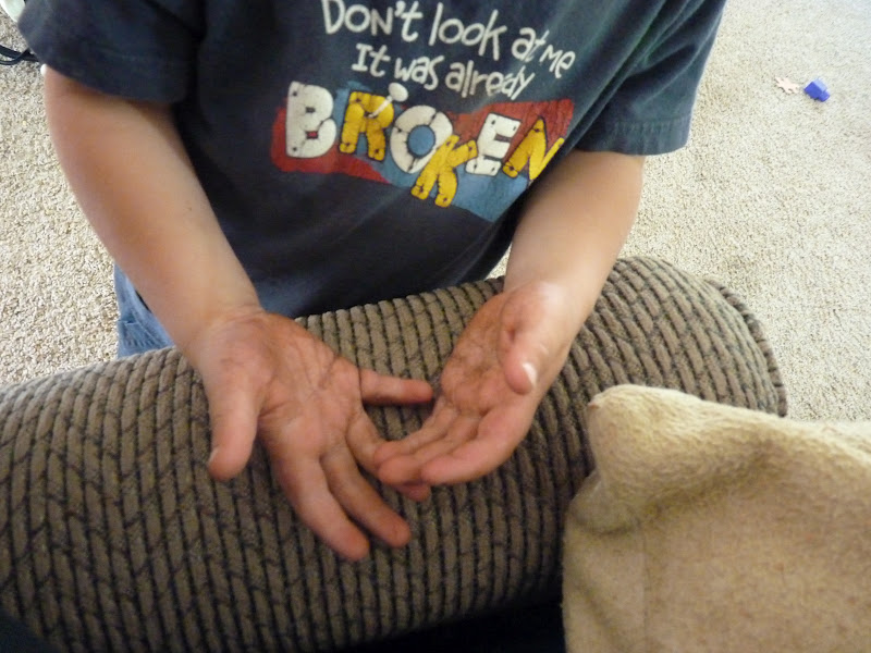 Isn't he sweet? I get some every day, but that particular day we grabbed a baby food jar, added a little water, and placed the two flowers he had brought me into the jar. He was so excited that he kept bringing more and more. Pretty soon, I had about a dozen yellow dandelions, three in the puffball stage (which unfortunately decided to shed all their seeds inside the house!) and one rock for good measure ;)